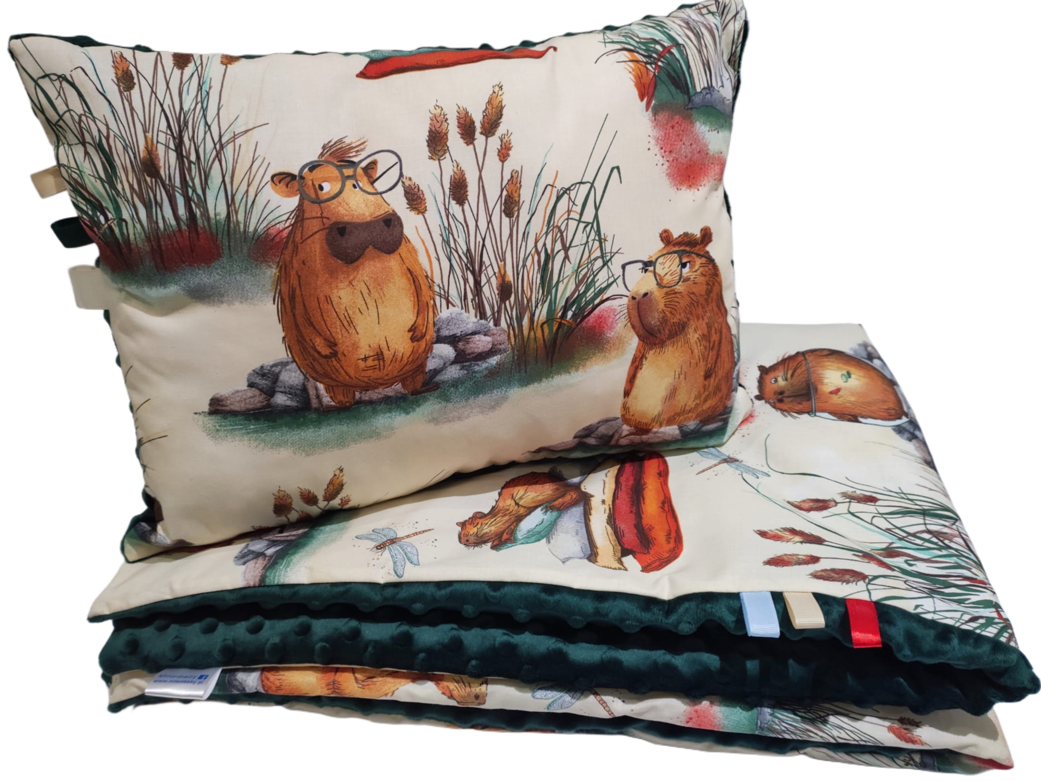 Kocyk 75x100 + Poduszka 30x40 – Kapibara z butelkową zielenią minky Zestaw do Przedszkola i Żłobka