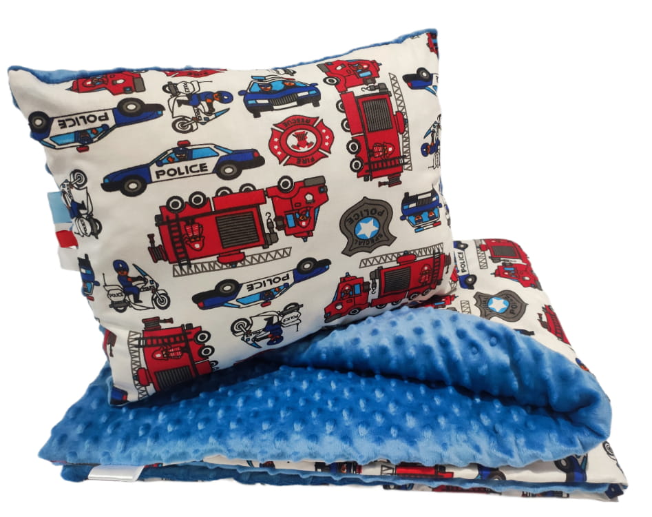 Kocyk Minky długi 80x220 lub 90x200 na leżaczek do Przedszkola Straż pożarna Policja + poduszka