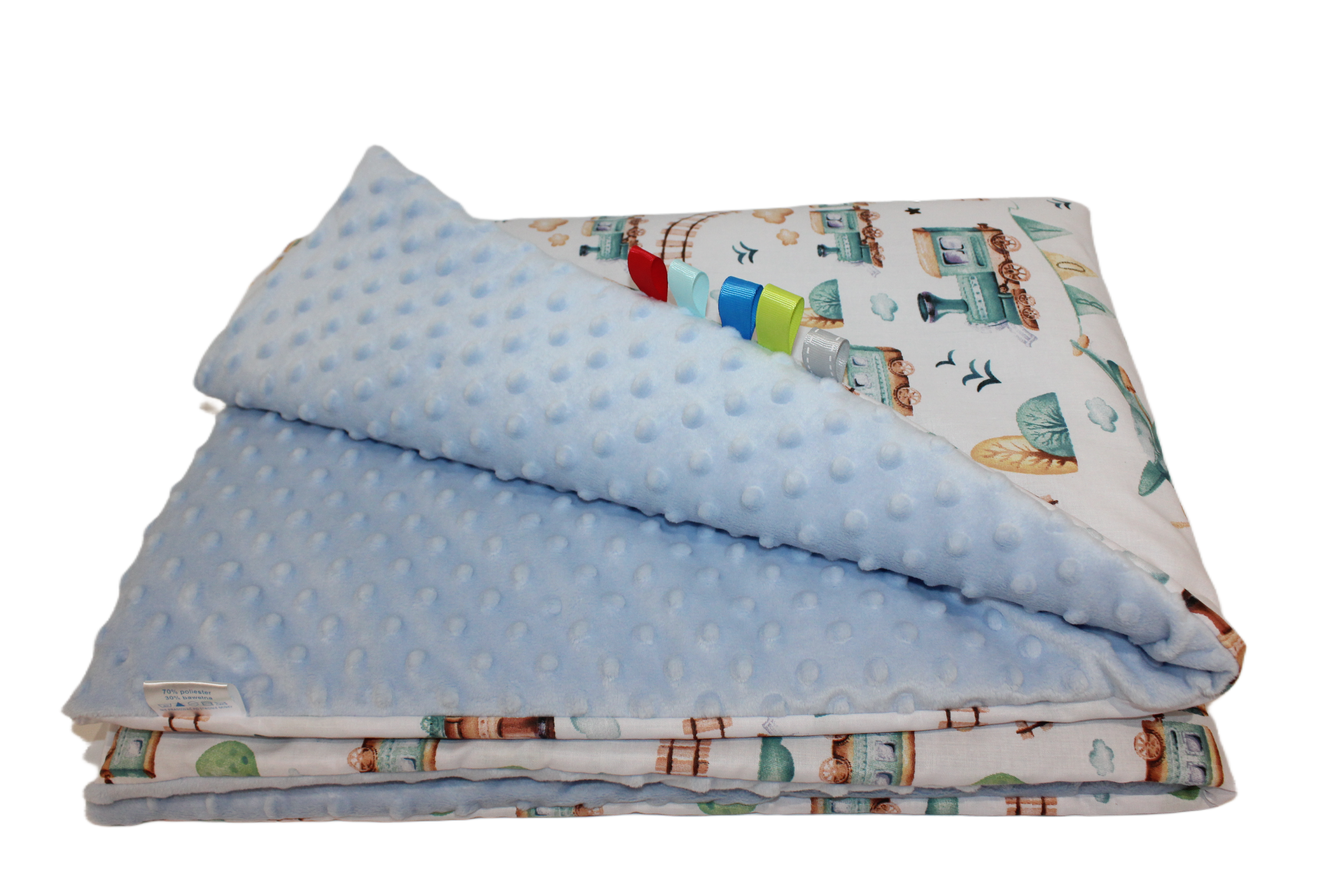 Wysokiej jakości materiały: Kocyk wykonany jest z jednej strony z miękkiego pluszu Minky, a z drugiej z kolorowej bawełny, co zapewnia przyjemność w dotyku i trwałość.