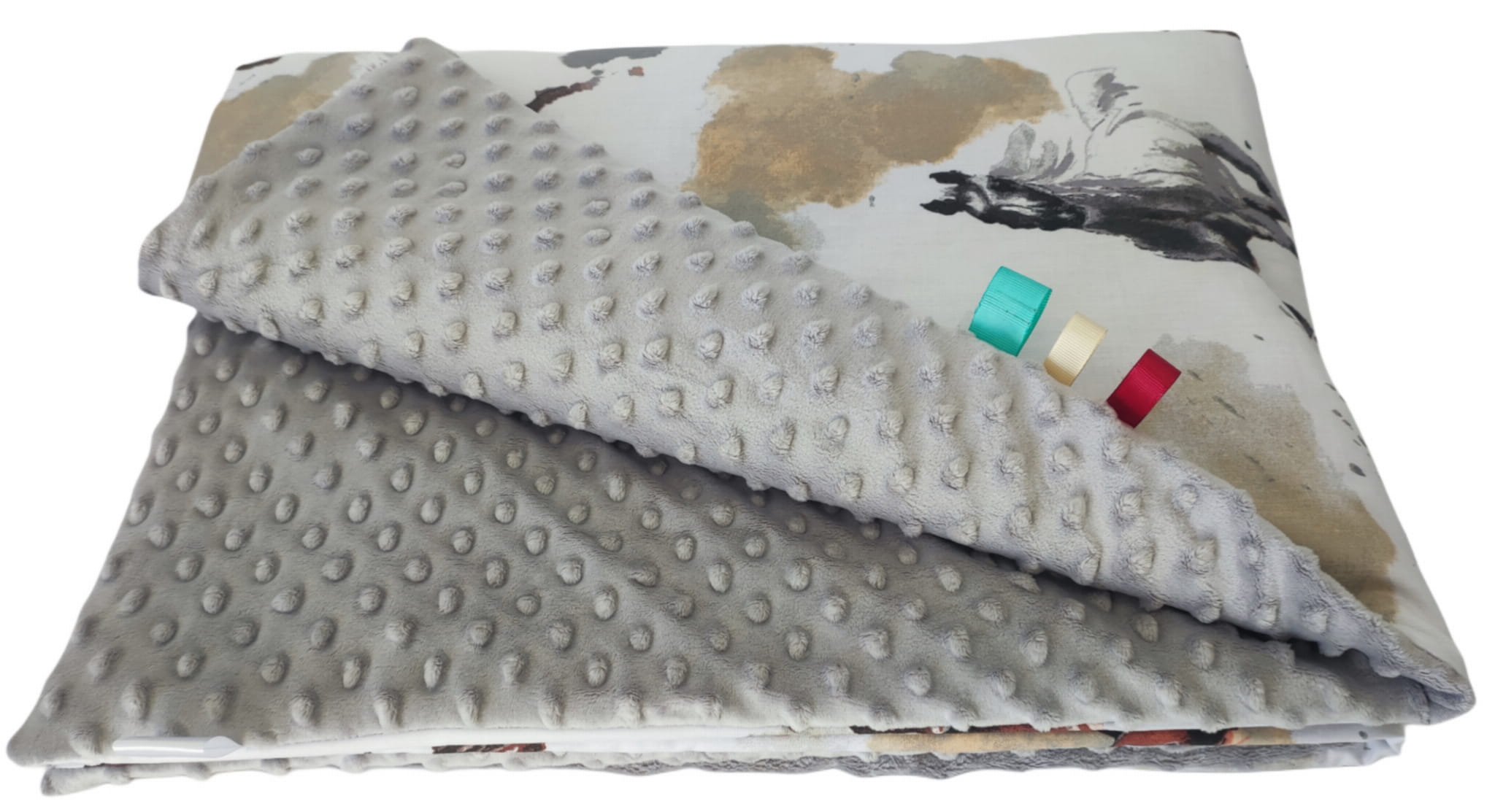 Wysokiej jakości materiały: Kocyk wykonany jest z jednej strony z miękkiego pluszu Minky, a z drugiej z kolorowej bawełny, co zapewnia przyjemność w dotyku i trwałość.