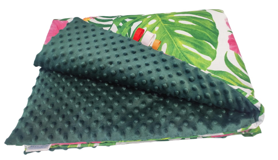 Wysokiej jakości materiały: Kocyk wykonany jest z jednej strony z miękkiego pluszu Minky, a z drugiej z kolorowej bawełny, co zapewnia przyjemność w dotyku i trwałość.
