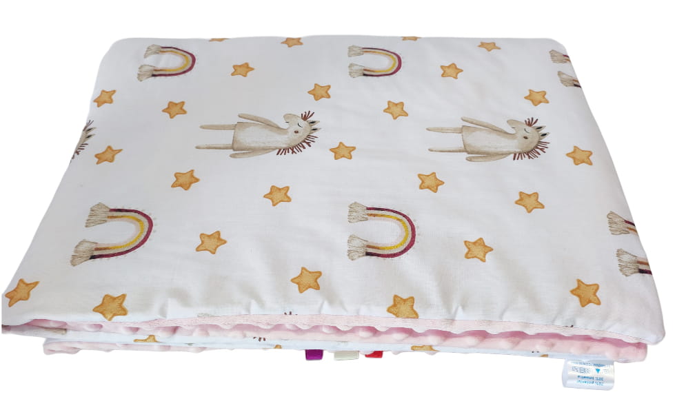 Wysokiej jakości materiały: Kocyk wykonany jest z jednej strony z miękkiego pluszu Minky, a z drugiej z kolorowej bawełny, co zapewnia przyjemność w dotyku i trwałość.