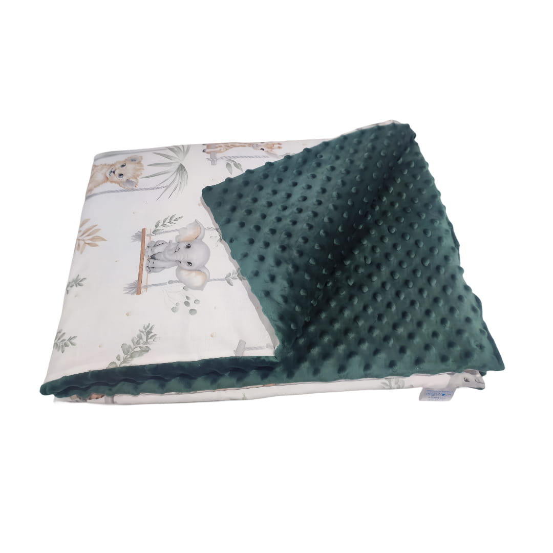 Kocyk Minky kołderka 160x200 żyrafki, słonie i tygrysy butelkowy zielony minky