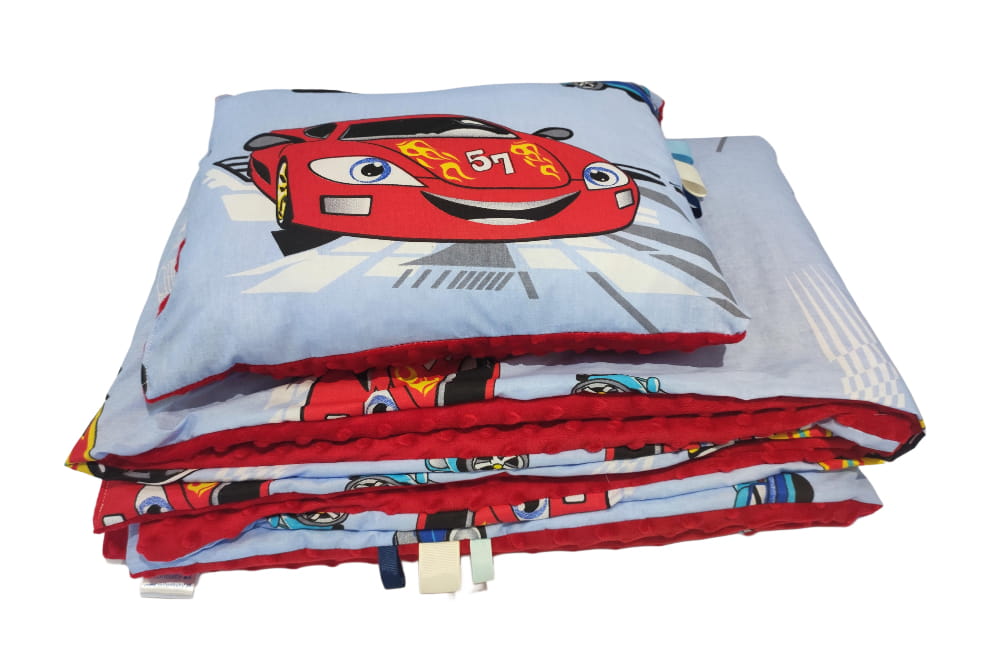 Kocyk i poduszka 75x100 + 30x40 – Auta na niebieskim tle + czerwony Minky