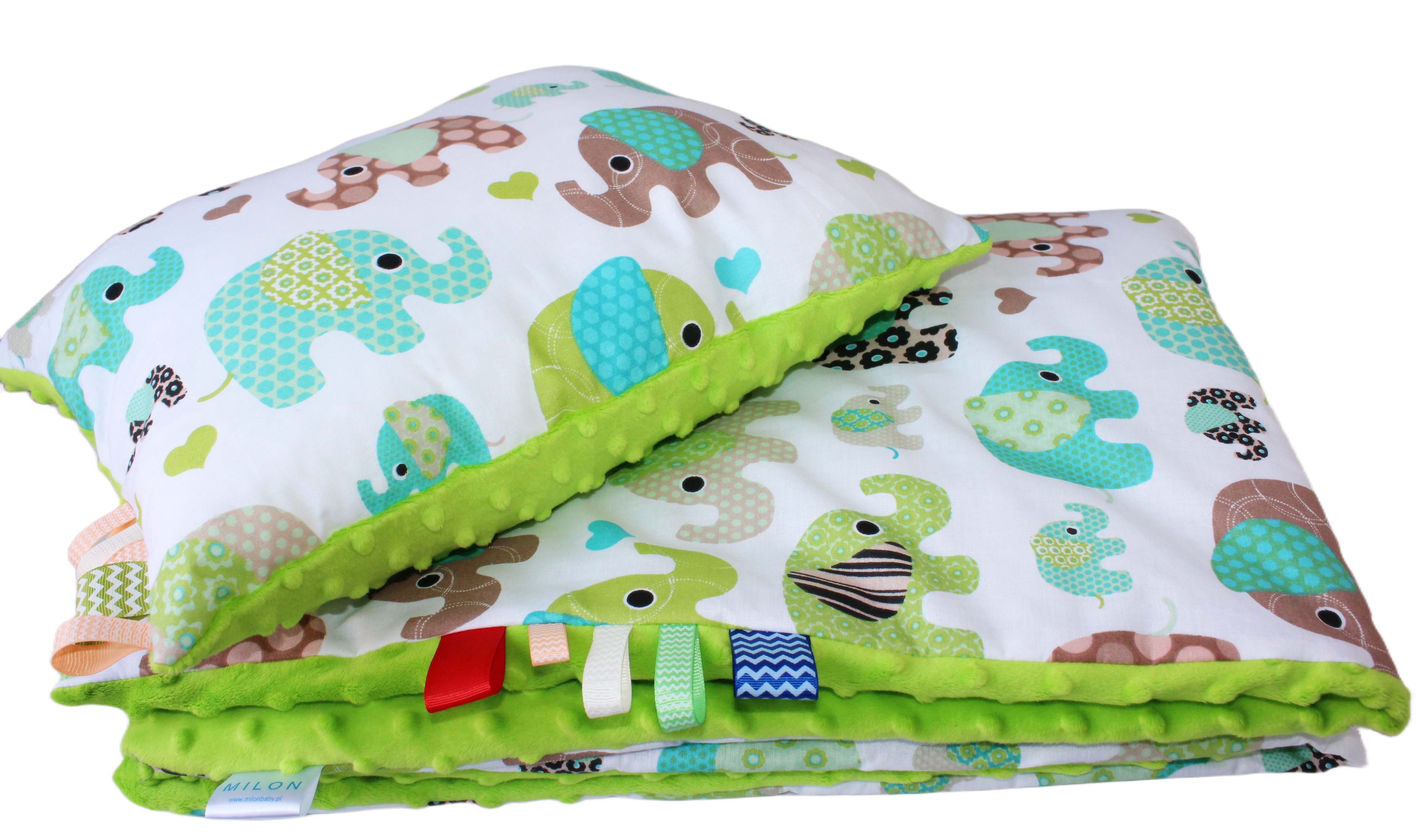 Kocyk i poduszka Minky do Przedszkola i żłobka 70x140, 100x135 lub 100x150 motyw Zielone słoniki
