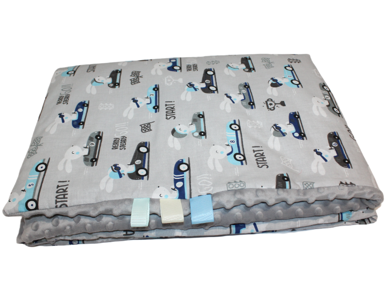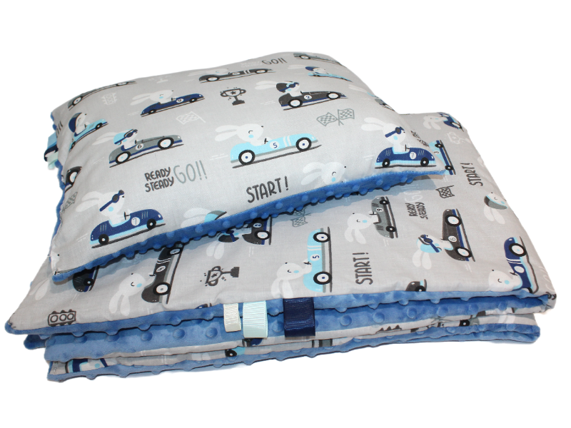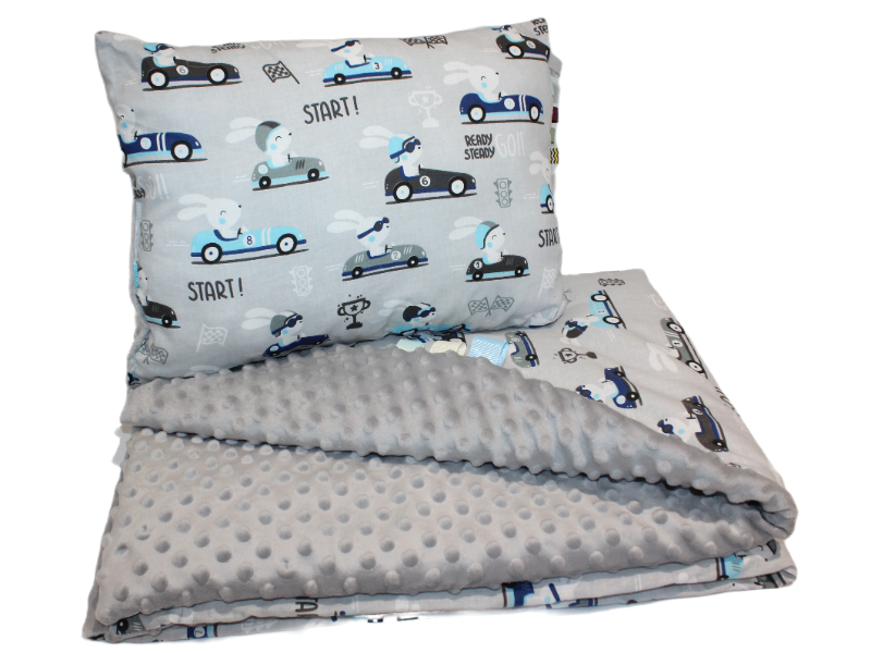 Kocyk i poduszka Minky do Przedszkola i żłobka 70x140cm, 100x115cm lub 100x150cm z motywem Królik rajdowy wyścigowy