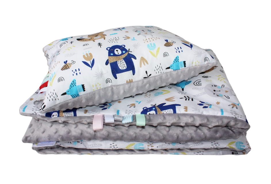 Kocyk z poduszką 75x100 + 30x40 cm – Leśne zwierzęta z szarym Minky – komplet dla dziecka