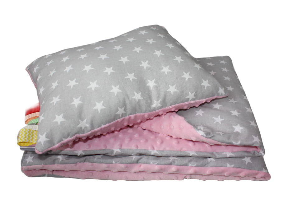 Kocyk z poduszką 75x100 + 30x40 cm – Szare gwiazdki z różowym Minky – pościel dziecięca