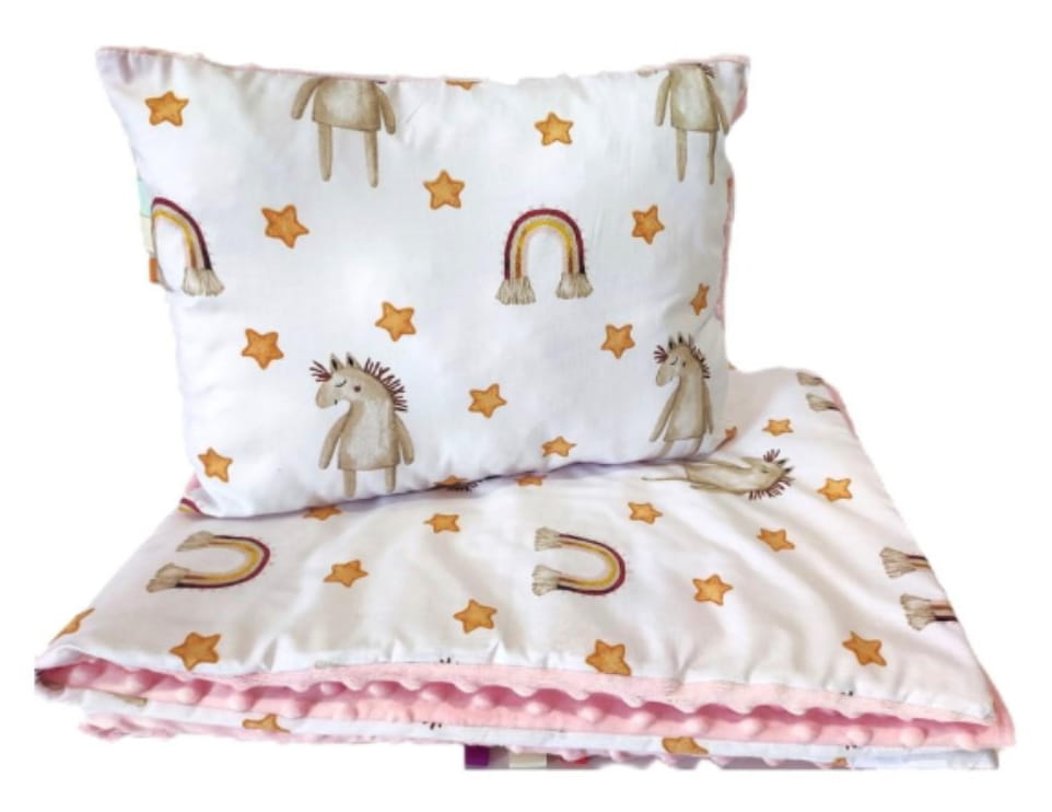 Kocyk z poduszką Minky 75x100 + 30x40 – koń z tęczą i gwiazdkami / różowy – do żłobka, przedszkola i domu
