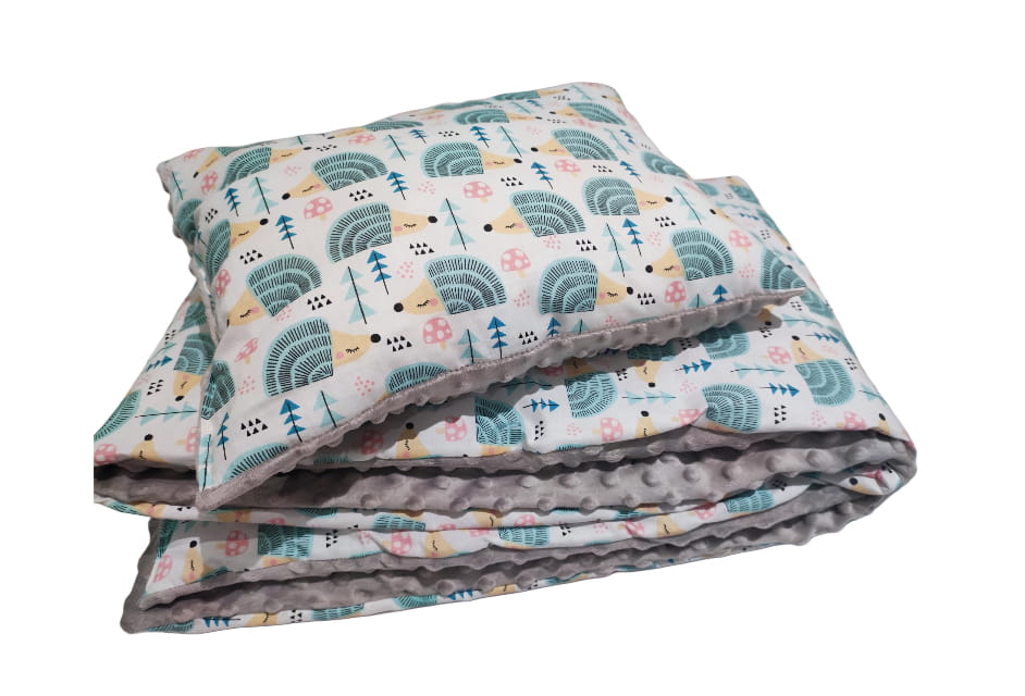 Kocyk z poduszką Minky 75x100 + 30x40 – miętowe jeże / szary – do przedszkola i żłobka