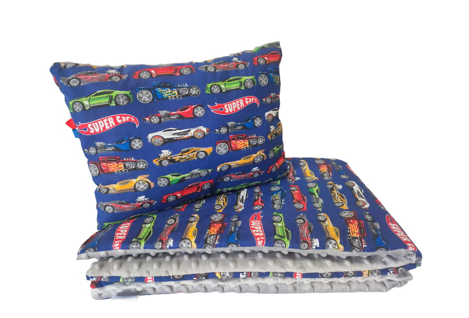 Kocyk z poduszką Minky 75x100 + 30x40 – wyścigówki / granatowy z szarym Minky – komplet chłopięcy