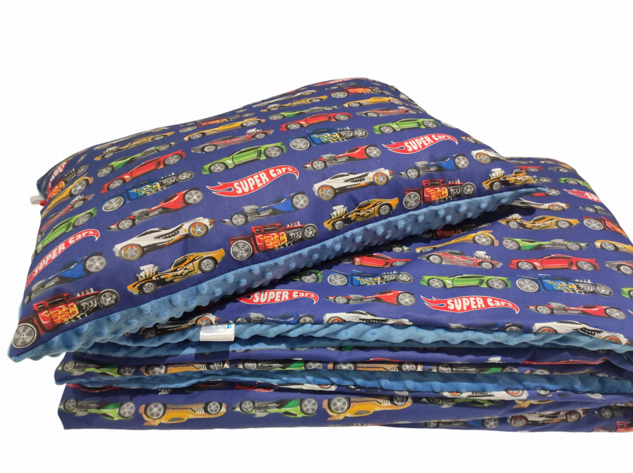 Kołdra Minky 160x200,150x200 lub 140x200 i poduszka Super cars z niebieskim Minky