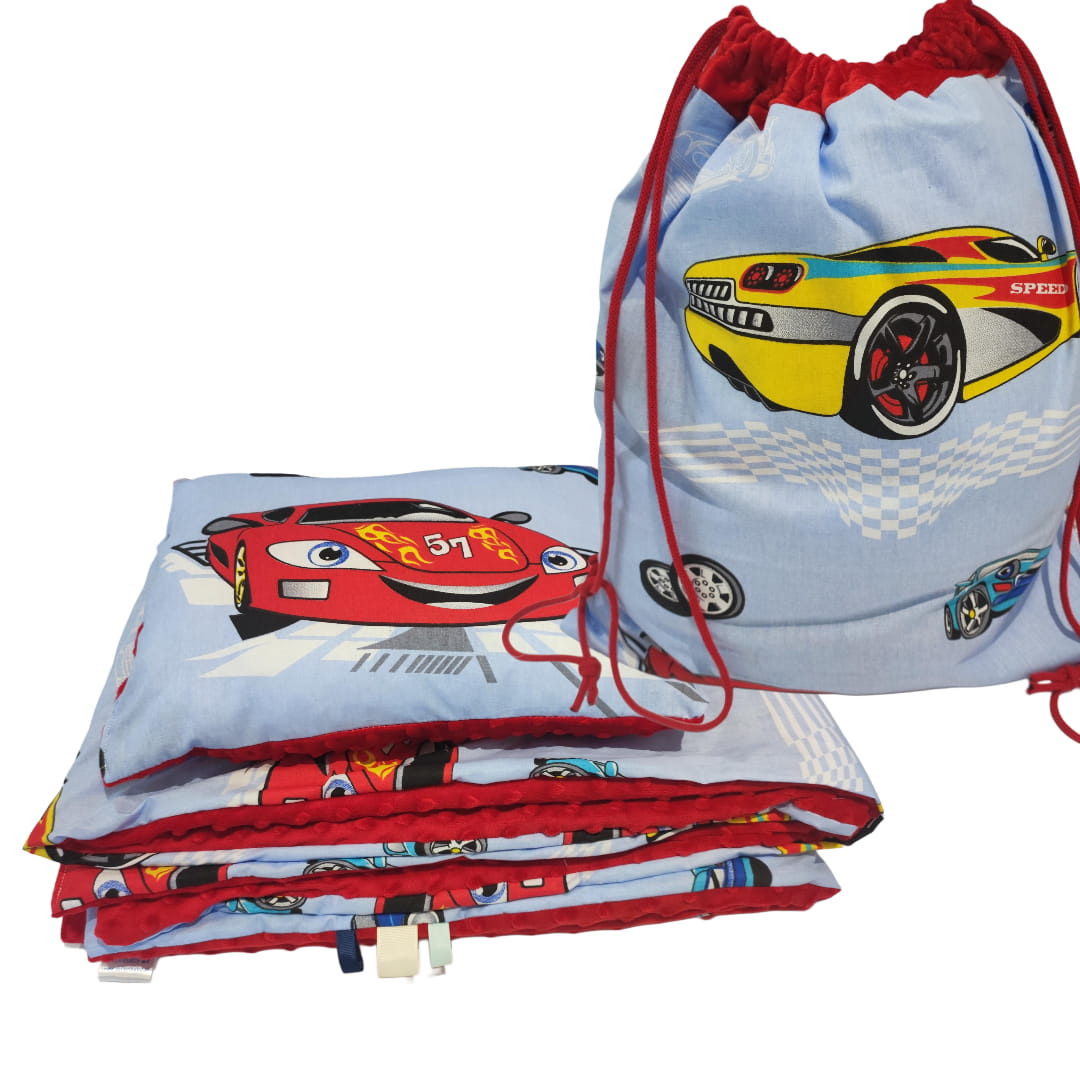 Pościel Minky Kocyk do Przedszkola z Workiem 100x135 30x40 z poduszką samochody na niebieskim tle