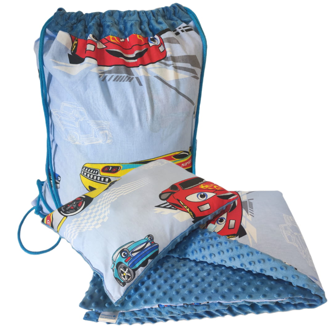 Pościel Minky do Przedszkola z Workiem 100x135 30x40 zestaw z poduszką Auta na niebieskim tle