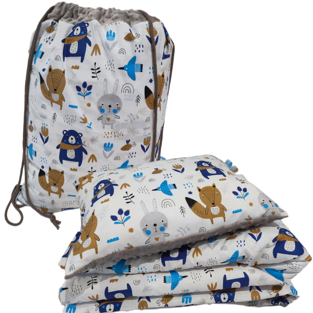 Pościel Minky do Przedszkola z Workiem 100x135 30x40 zestaw z poduszką Leśne zwierzęta z szarym Minky