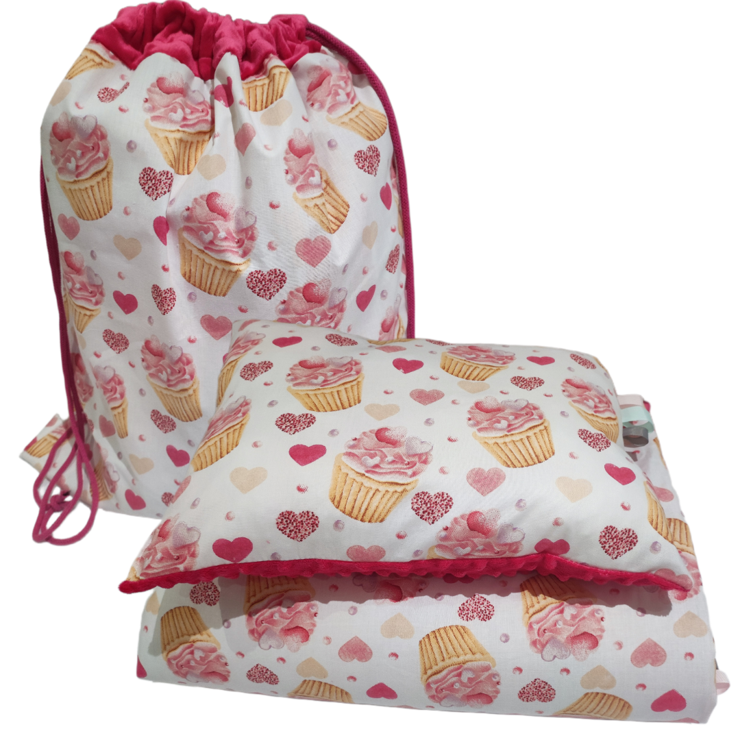 Pościel Minky do Przedszkola z Workiem zestaw 100x135 30x40 z poduszką Babeczki z fuksją Minky