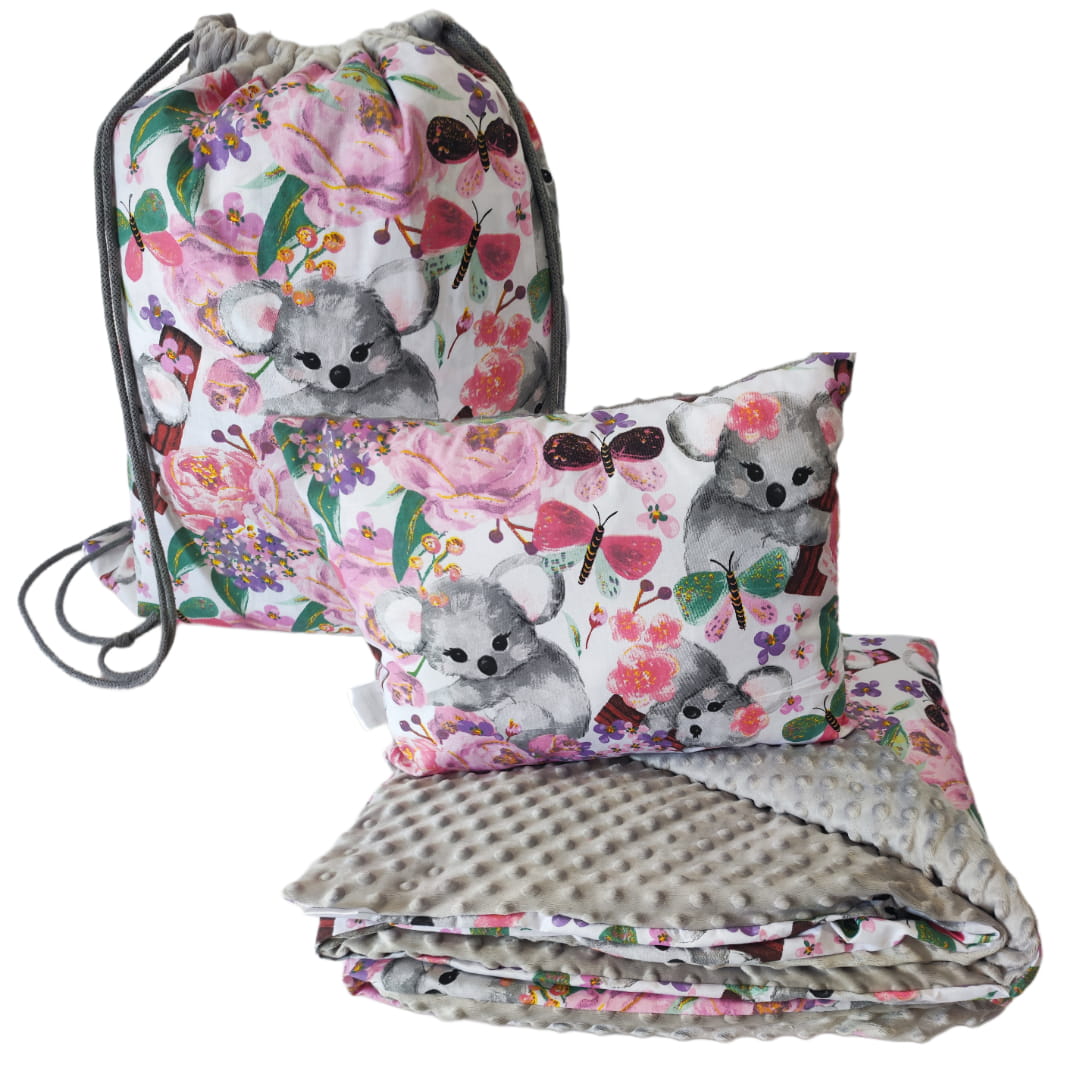 Pościel Minky do Przedszkola z Workiem zestaw 100x135 30x40 z poduszką Koala w kwiatach z szarym Minky