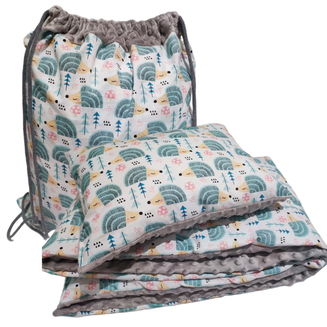 Pościel Minky do Przedszkola z Workiem zestaw 100x135 30x40 z poduszką Miętowe jeże z szarym Minky