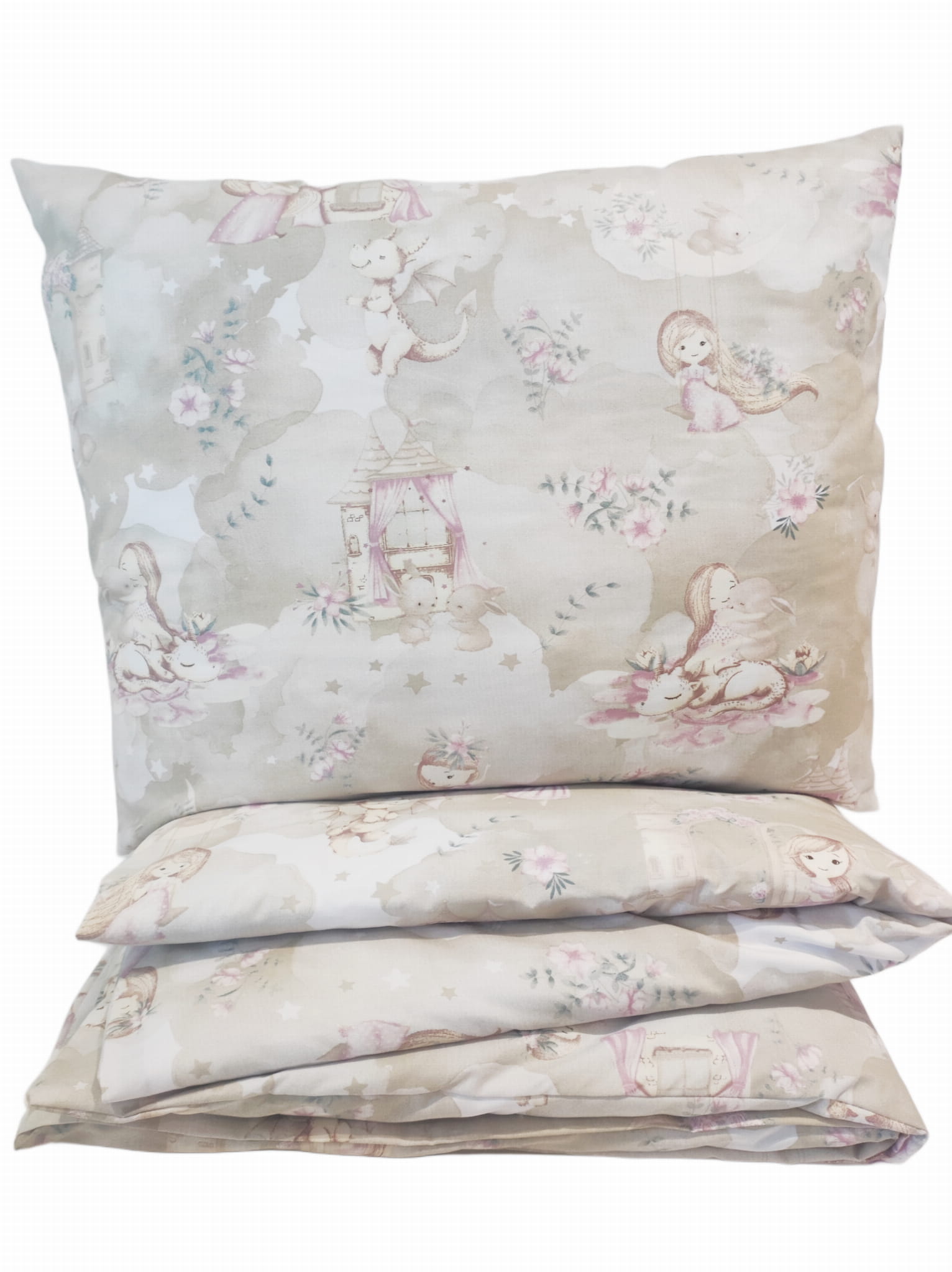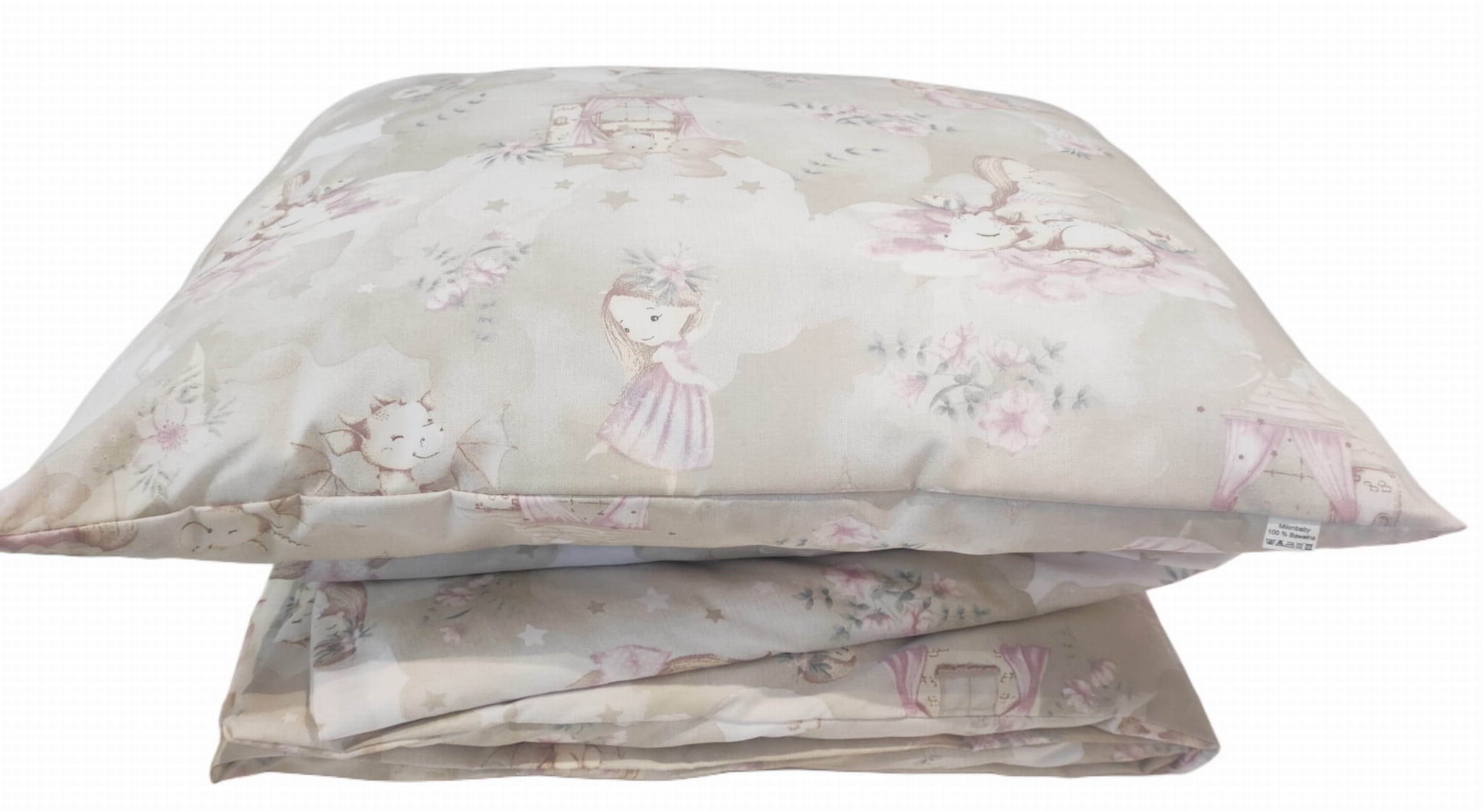Pościel bawełniana 100x135 + 60x40 – Dziewczynka, zamek i smoki na beżowym tle | Subtelna bajka do snu