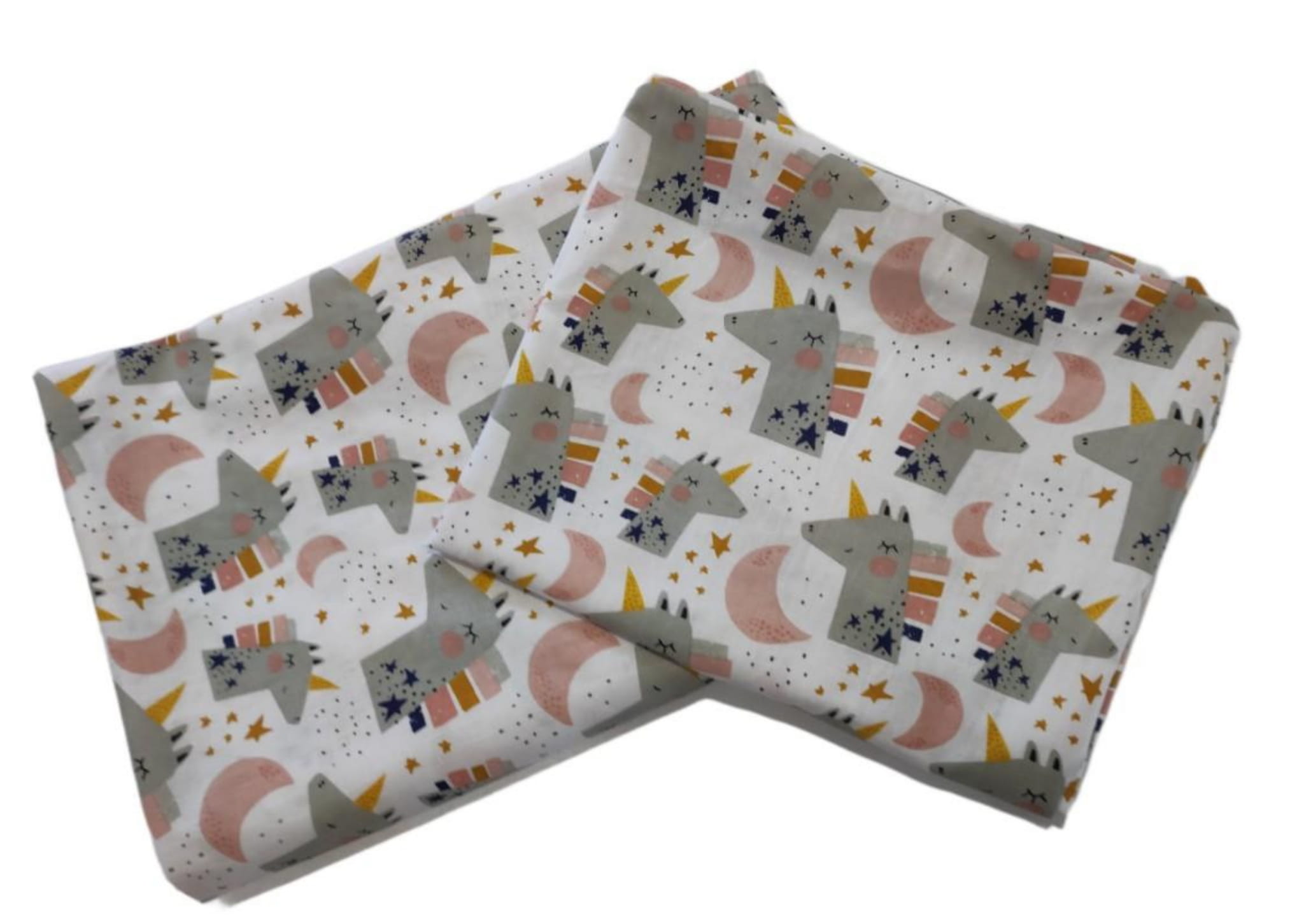 Pościel bawełniana 100x135 + 60x40 – Jednorożce i księżyce na białym tle | Magiczny wzór do łóżeczka