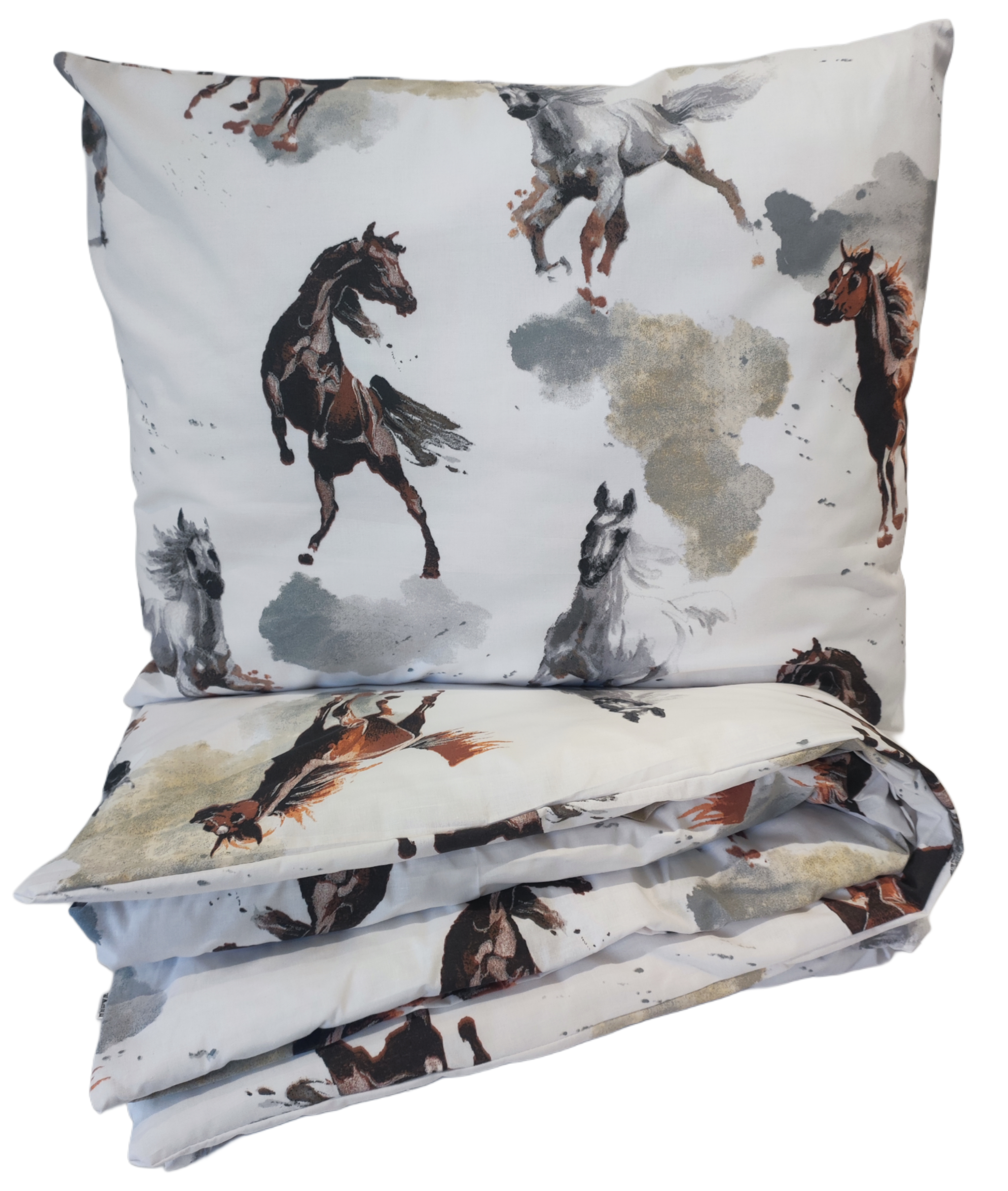 Motyw koni to klasyka dziecięcych marzeń. W tej pościeli konie w naturalnych odcieniach beżu i szarości przedstawione są na białym tle – dzięki czemu wzór jest subtelny, a zarazem wyjątkowy. To doskonały wybór dla dzieci kochających zwierzęta i przyrodę.
