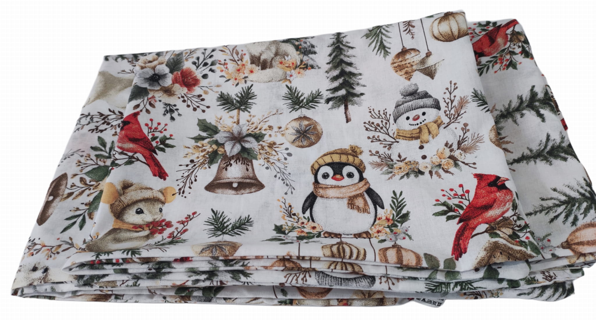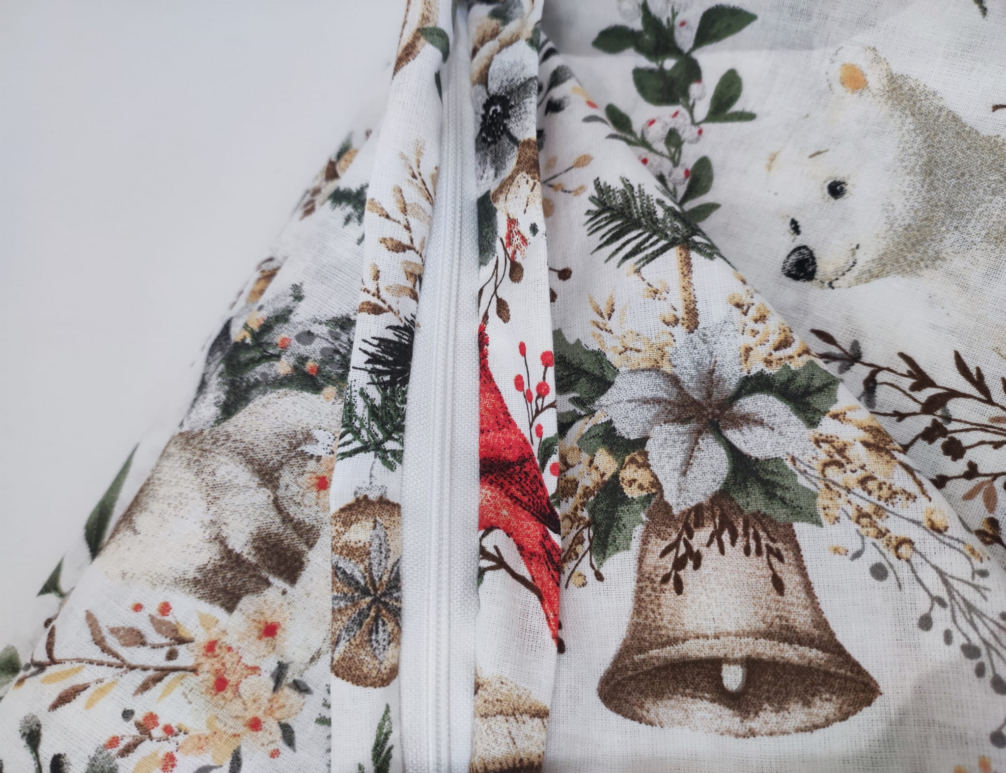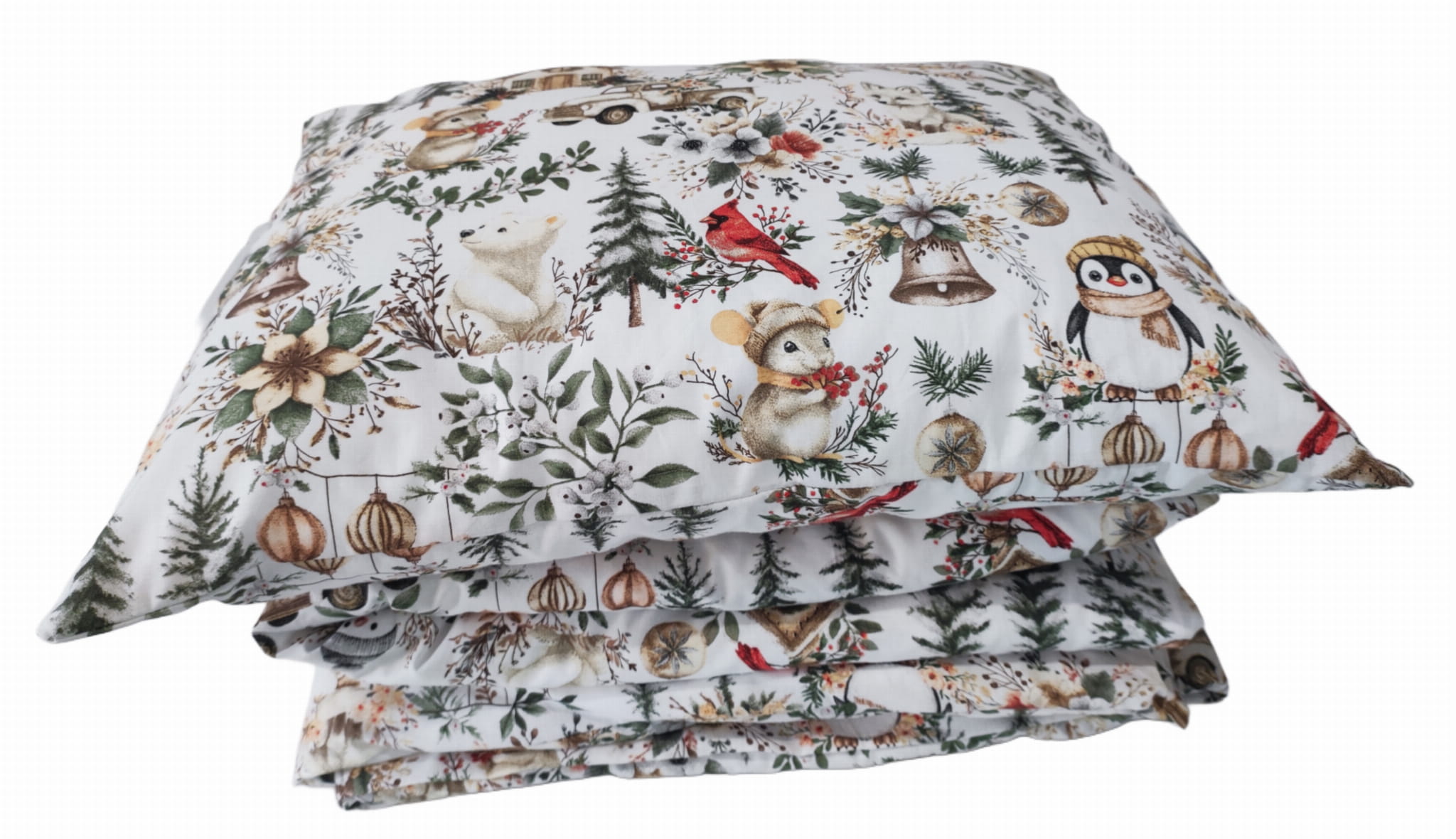Wzór przedstawia subtelne beżowe bombki, uroczego bałwanka, pingwinka, choinki i dzwoneczki, tworząc efekt „boho Christmas” — lekki, neutralny i bardzo estetyczny. Komplet świetnie sprawdzi się w pokoju dziewczynki i chłopca.