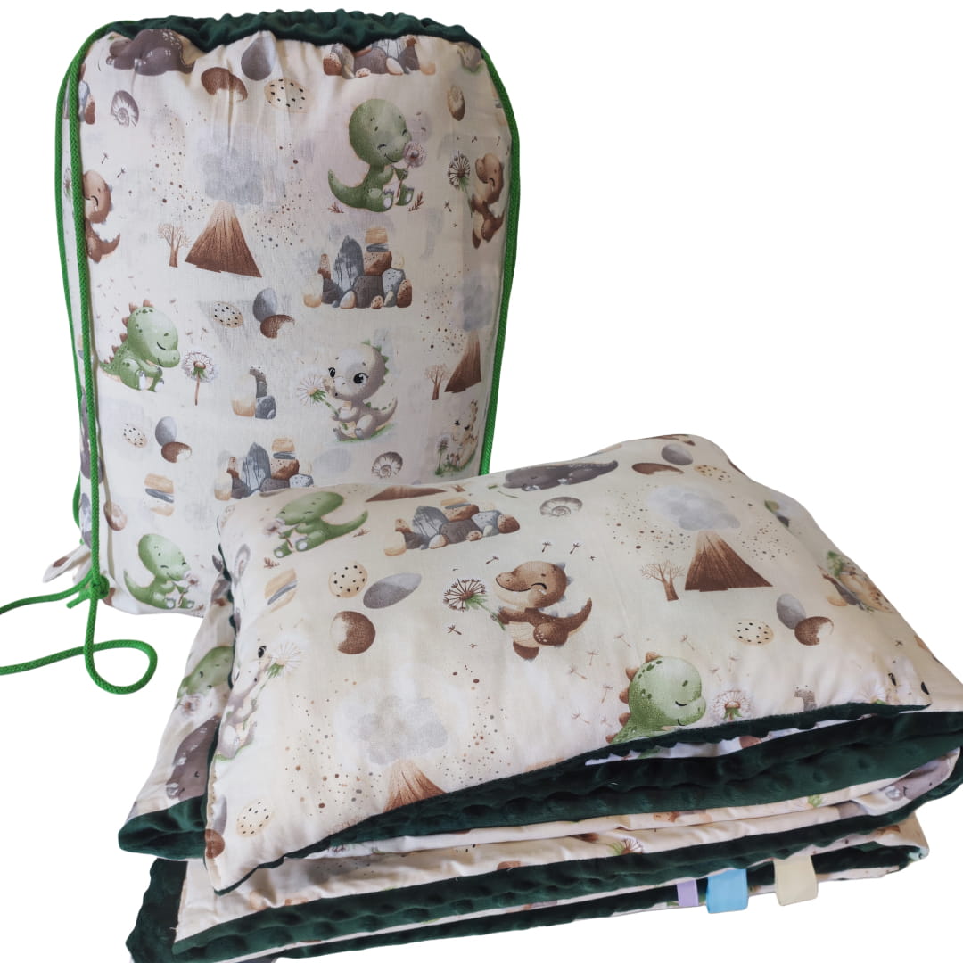 Pościel do Przedszkola z Workiem 100x135 30x40 zestaw Minky z poduszką Dinusie z butelkowym zielonym