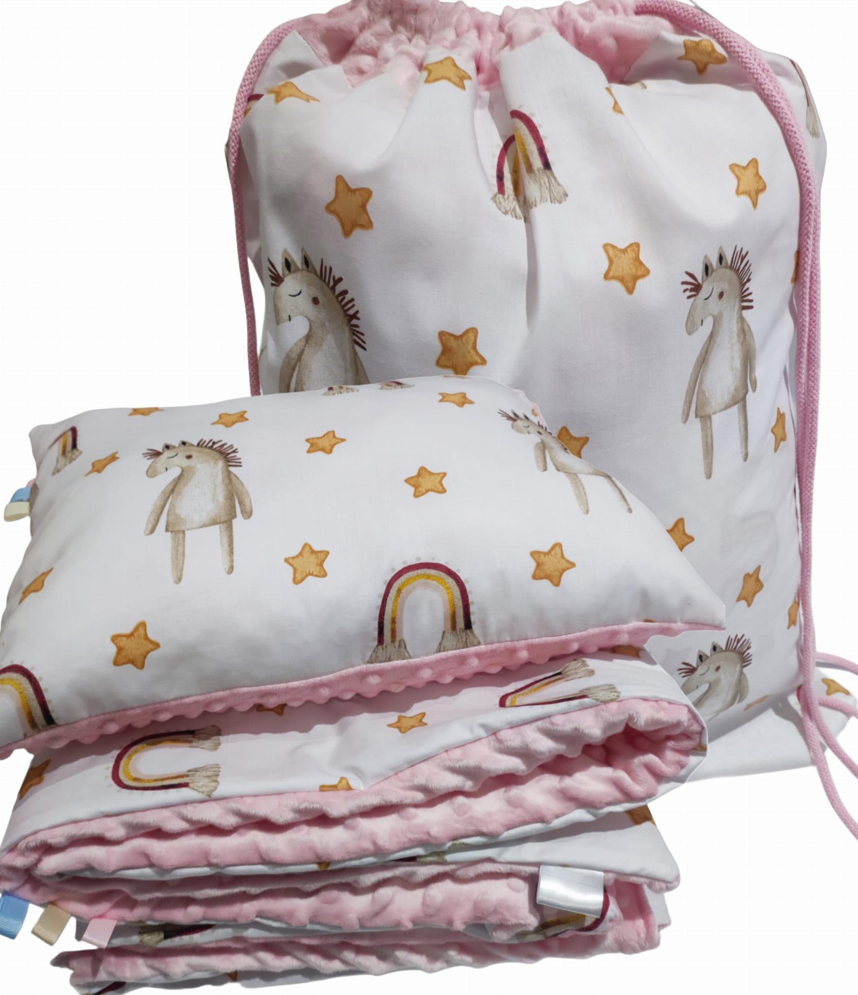 Pościel do Przedszkola z Workiem 100x135 30x40 zestaw Minky z poduszką Konik z tęczą na bieli