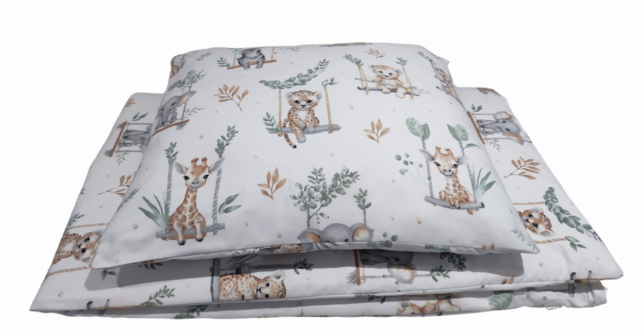 Szukasz idealnej pościeli do łóżeczka dziecięcego? Nasz komplet 135x100 cm + 60x40 cm we wzorze tygrysy, żyrafy i słonie na huśtawce , zapewniając komfortowy i zdrowy sen każdej nocy.