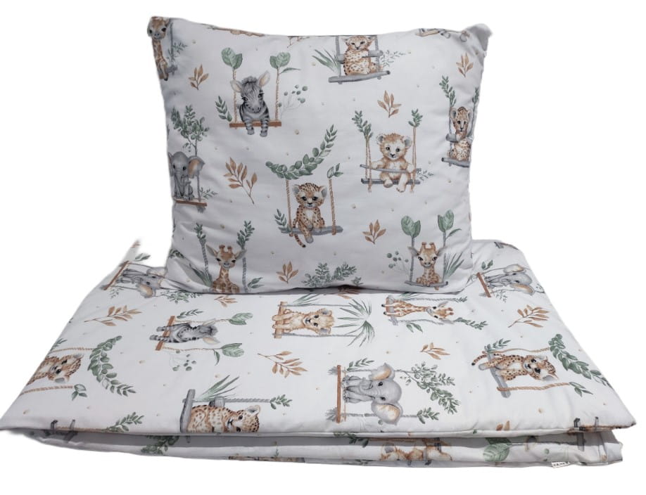 Szukasz wysokiej jakości pościeli bawełnianej dla swojego dziecka? Nasz komplet w rozmiarze 120x160 cm z poszewką na poduszkę 50x60 cmto doskonały wybór do dziecięcych łóżek. Motyw ze zwierzętami słoniami, żyrafami oraz tygrysami na huśtawce poleca się dla miłośników zwierząt oraz przyrody. Komplet pościeli wykonany z 100% naturalnej bawełny, zapewnia miękkość, przewiewność i komfort snu przez cały rok.