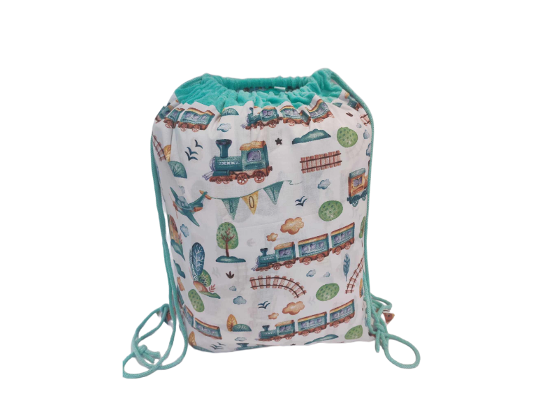 Worek do Przedszkola , na WF Bawełniany 35x40 Ciuchcia z miętowym Minky - Worko-Plecak ze Sznurkami, Tunel Minky, Metka na Imię