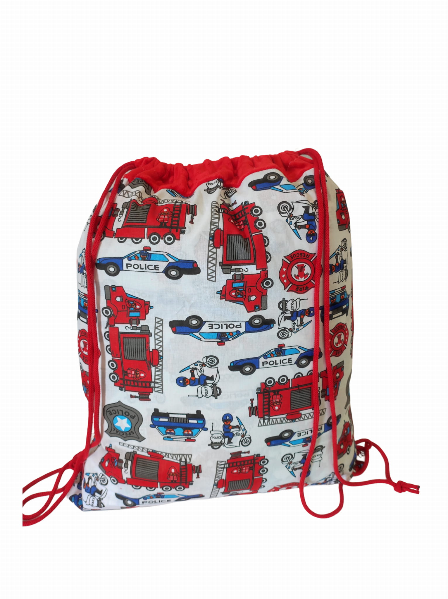 Worek do Przedszkola Bawełniany 35x40 na wf Straż pożarna, policja z czerwonym Minky - Worko-Plecak ze Sznurkami, Tunel Minky, Metka na Imię
