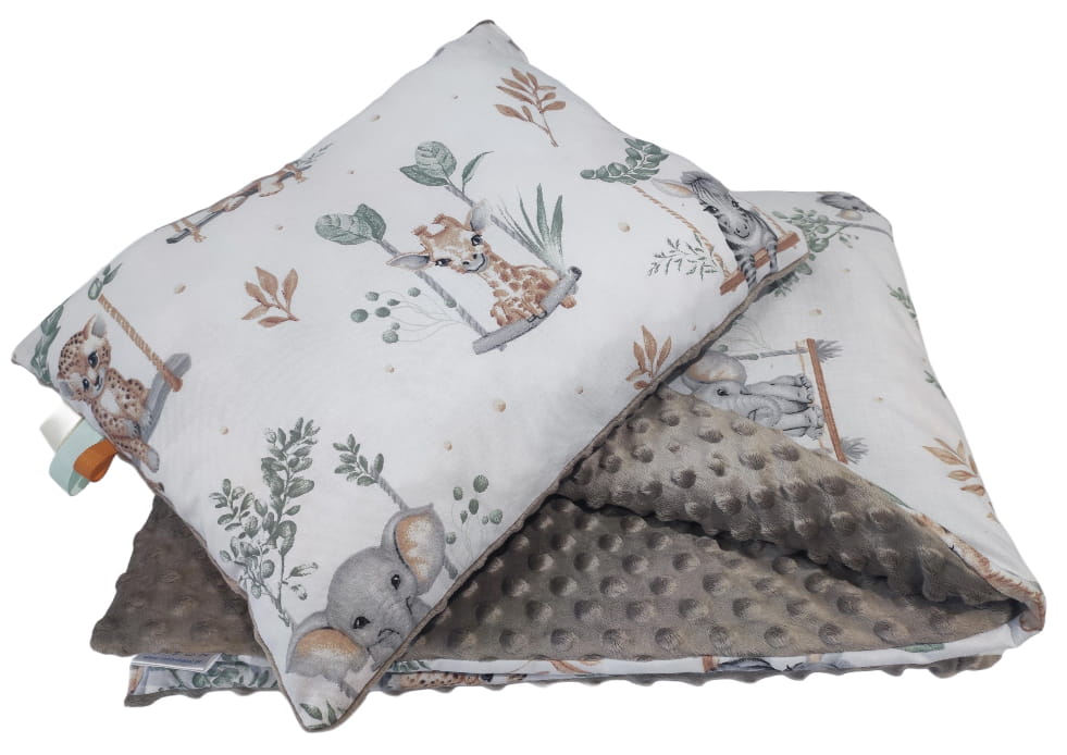 Kocyk i poduszka 75x100 + 30x40 – Zwierzątka na huśtawkach + beżowy Minky