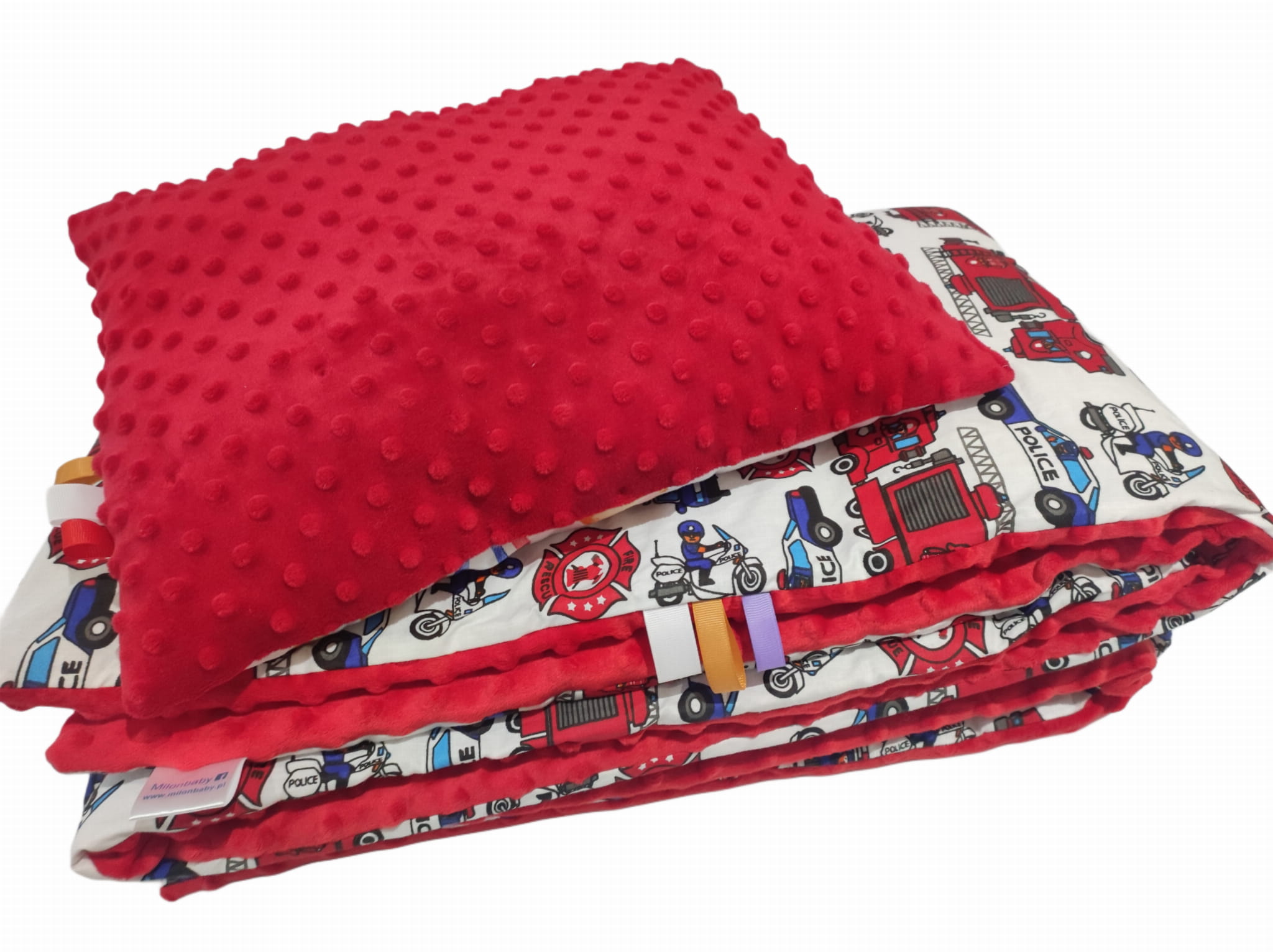 Kocyk i poduszka 75x100 + 30x40 – Straż pożarna, policja i pojazdy ratunkowe + czerwony Minky