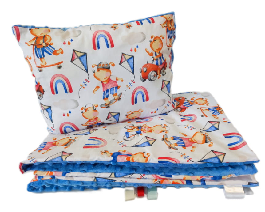 Kocyk i poduszka 75x100 + 30x40 – Wesołe pieski, pojazdy i tęcza + niebieski Minky